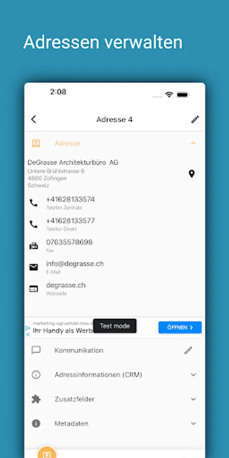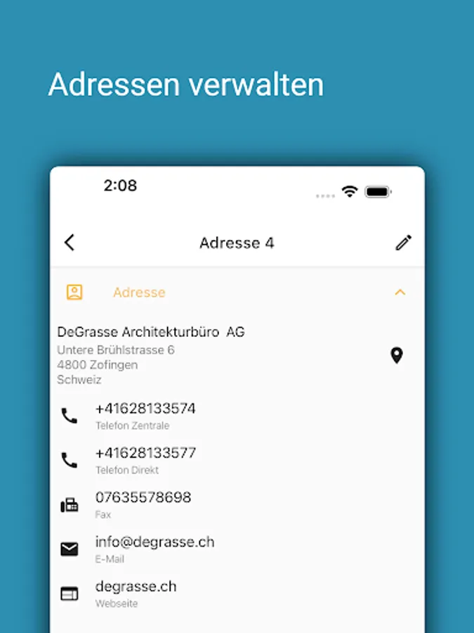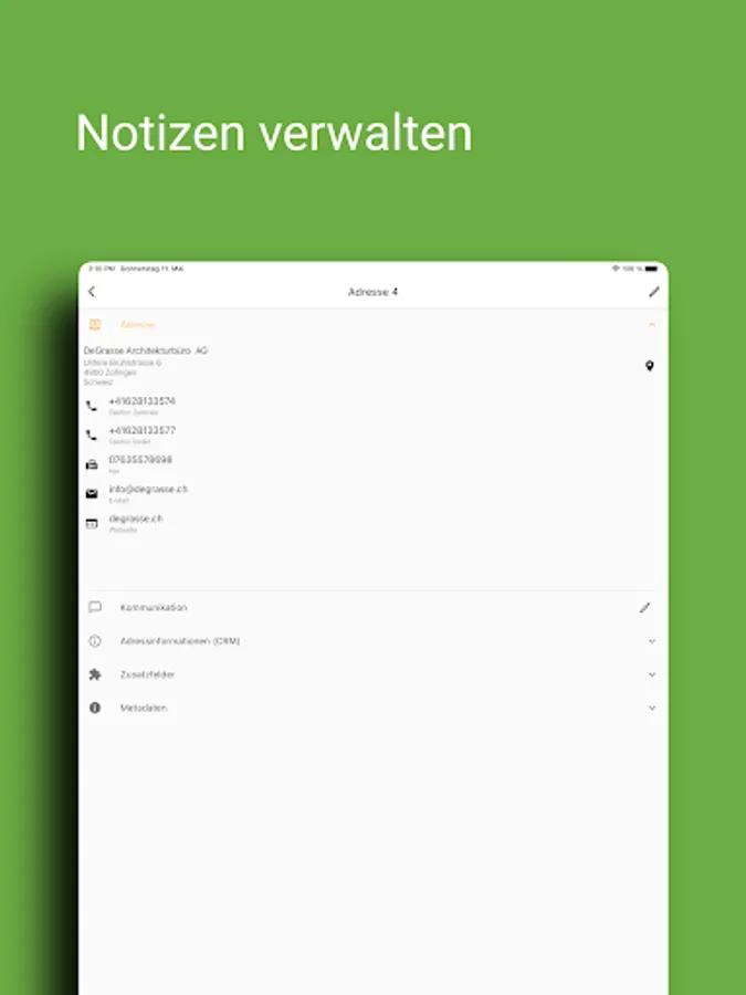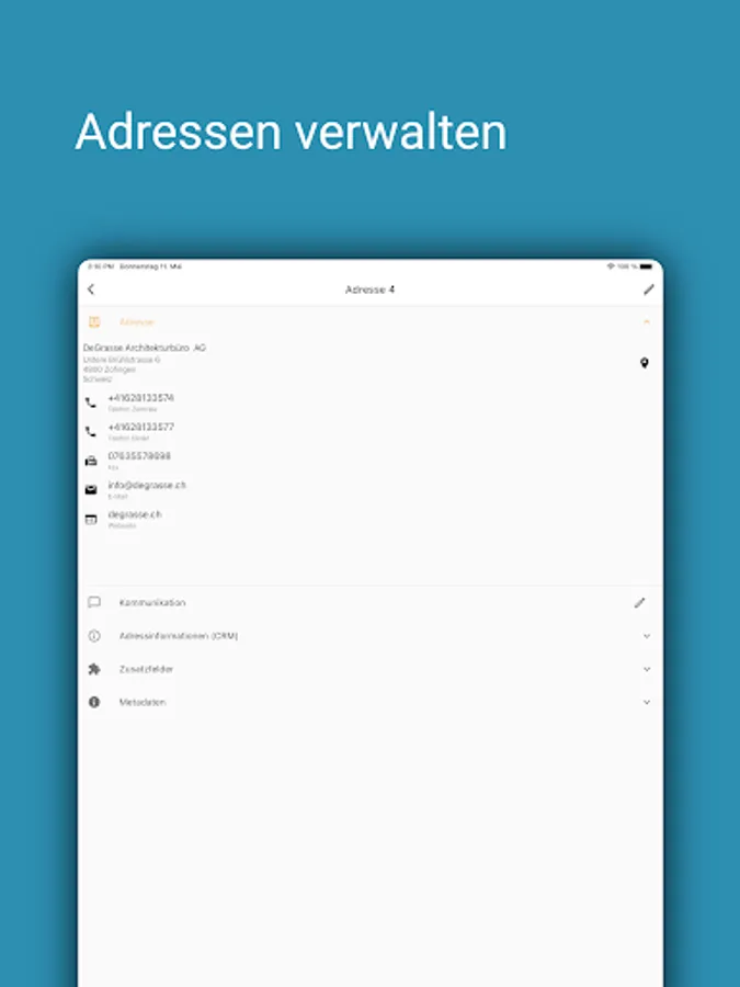 With pfx addresses, all addresses, contacts and notes from Proffix are always with you on your mobile devices. A document preview and self-configurable key figures (address information) from Proffix CRM are also available.