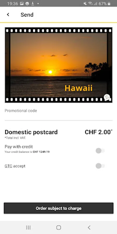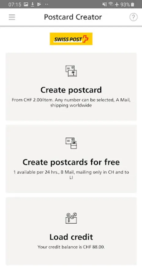 Wherever you are, with PostCard Creator you can send one free postcard directly from your smartphone every 24 hours and an unlimited number of postcards from CHF 2.10, each in A6 format.