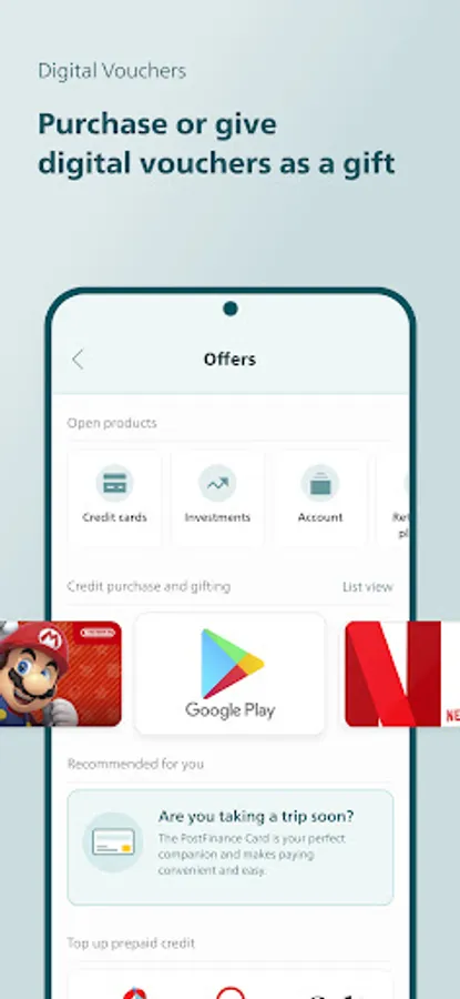 • Purchase digital vouchers for Google Play Store, paysafecard, Netflix, etc. and prepaid credit for mobile phones, or give the vouchers as a gift