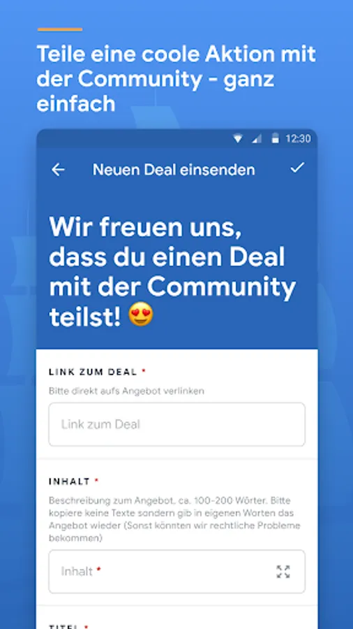With the app, entering an offer for price piracy has become even easier. Easily take the deal picture via your mobile phone camera and create deals directly on the go.