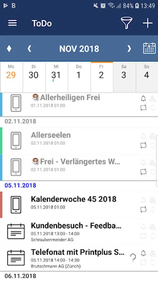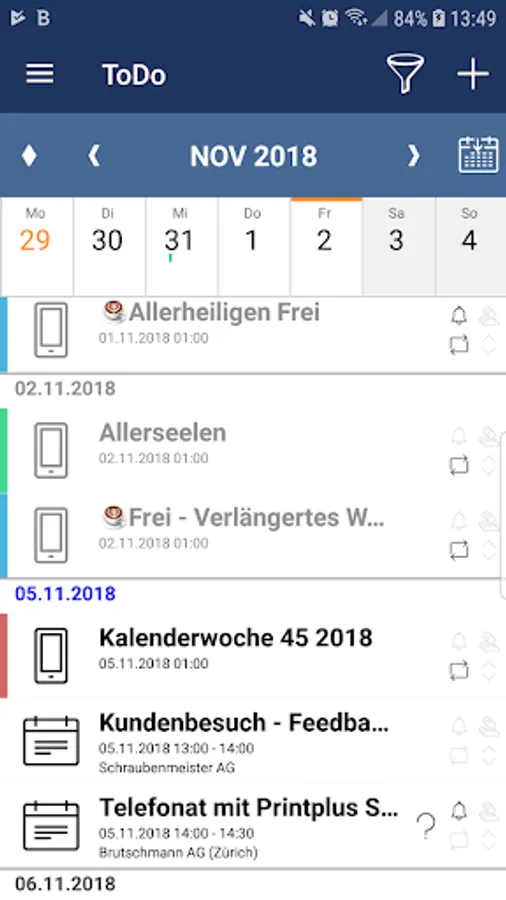 - For scheduling appointments, it is possible to integrate further calendars of the device into Printplus Mobile. View the holidays or private appointments in the app without saving them to the company database.