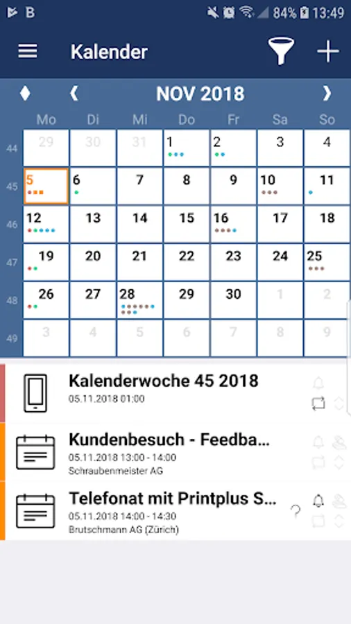 - The calendar is provided as an alternative to the ToDo list. The month view shows the quick overview of the whole month. Dates and tasks are marked with different colors and allow a quick assessment of the month. The view is supplemented with the daily list for the individual marked tag.