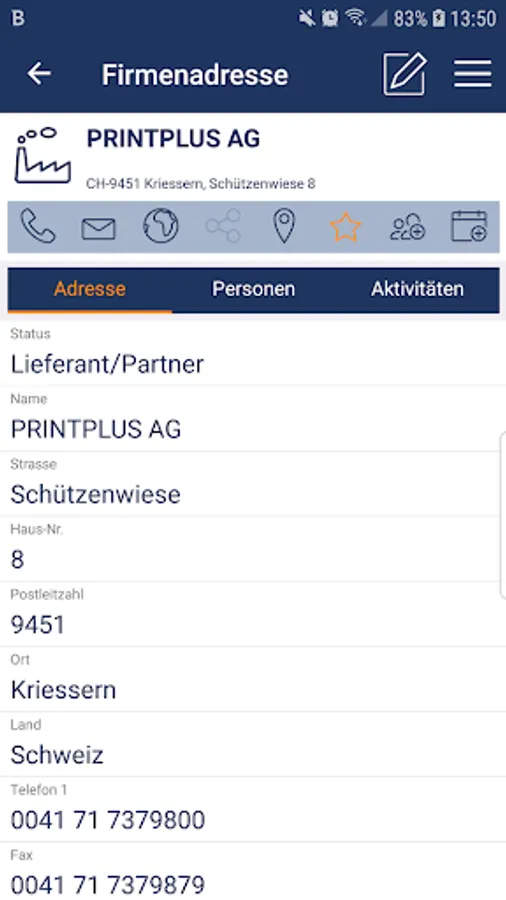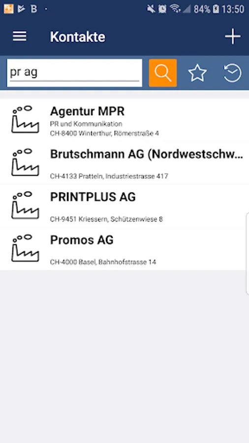 - The contacts allow access to the addresses and contact persons from the IVIS or the data collected by you in the app. The most important partners can be marked as favorites and are available for quick access. In the address view you will see the contacts of the address and the activities. Combined with the data reconciliation, the field service employee is always promptly informed about all activities with the address and contact person. The quick access bar is also available in this view.