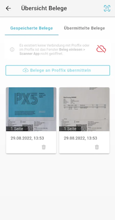 With the receipts that have already been transmitted, you have the option of moving them back to saved receipts in order to then transmit them again. The configuration for the app is carried out once, then the Proffix Scanner App remains connected to the Proffix if there is an internet connection.