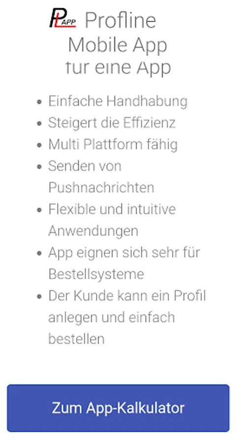 The app calculator calculates you quickly and easily the cost of your app, based on a requirements profile which you create.