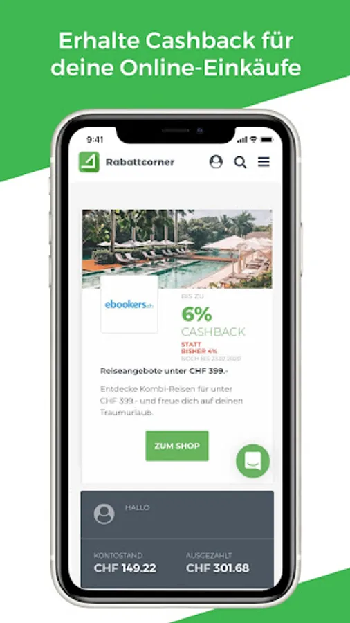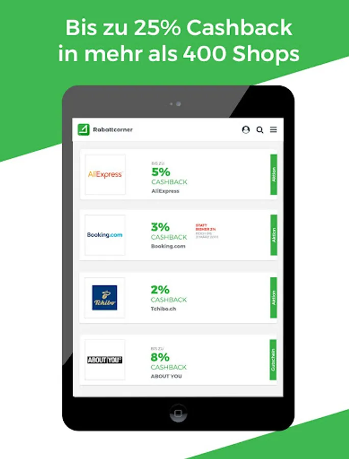 Save on your online purchases! With the discount corner and the discount corner app you get up to 25% cashback on all your purchases in more than 400 online shops and travel platforms such as SWISS, Booking, AliExpress, Tchibo or ABOUT YOU.