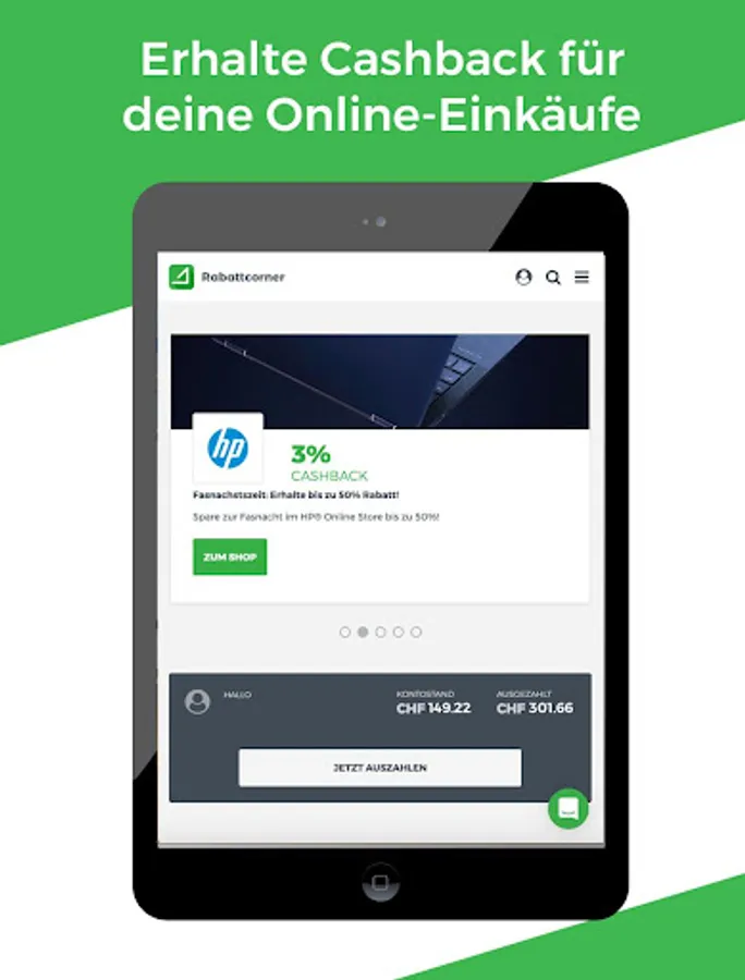 With our cashback app you can get back up to 25% cashback in many well-known Swiss and international shops. Our partners include ebookers, Zalando Lounge, Media Markt, Dosenbach, Ochsner Sport, Manor, Sunrise, Marionnaud, Zooplus, Nu3.ch, Bonprix, Jelmoli Versand and many more. Thanks to the variety of our partner shops, you will find the right services or products, whether you are looking for travel, fashion, electronics, food, furniture, beauty or DIY supplies. In addition, new shops are added every day! Download our app now to save money when you buy products from Nike, Bose, Apple or HP Store.