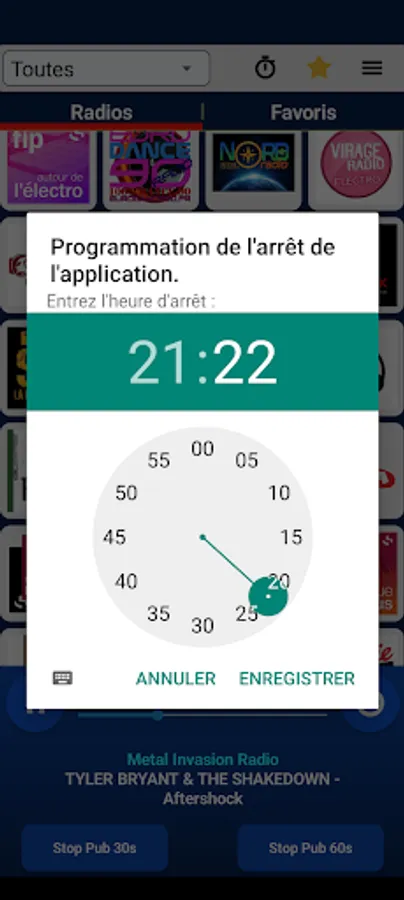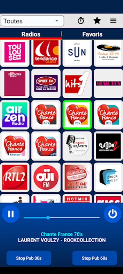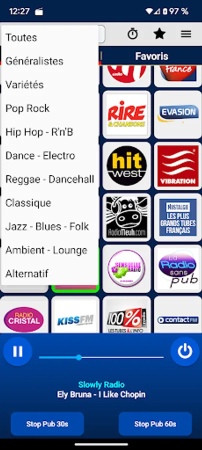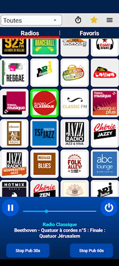 To replace ads with music for 30 or 60 seconds: click on one of the "Stop Pub" buttons.