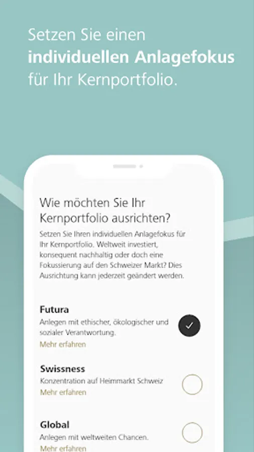 Raiffeisen Rio is your simple and completely digital access to investing. With an investment of CHF 5,000 or more, you receive a portfolio tailored to your needs, which is actively managed and monitored by experts. You set the focus and complement your portfolio with investment themes whose potential you are betting on. Our specialists will provide you with regular information on individual investment topics, investment trends and news. Now simply create topics and interests-based with Raiffeisen Rio, our experts will take care of the rest!