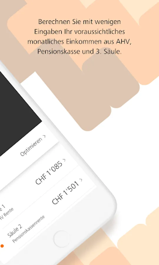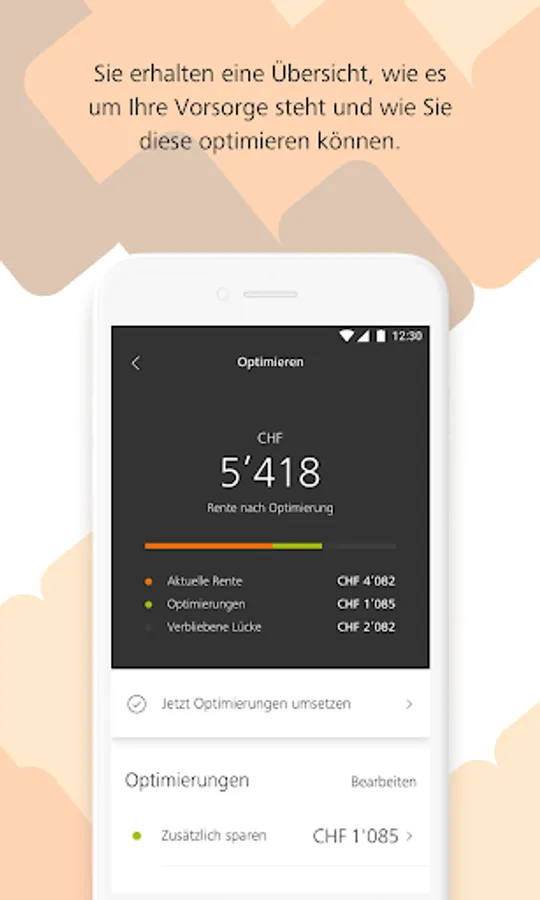 Individual tips for optimization: Receive concrete suggestions for optimization - tailored to your personal situation. The app shows you any gaps in your pension plan and how to close them. You can run simulations yourself.