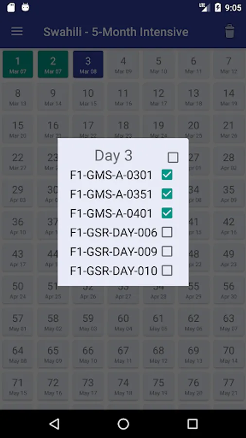 This is a tool to keep track of your progress in the new Glossika (http://www.glossika.com) language learning schedules. I wrote this app to help me keep track of which GSR and GMS files i needed to do every day. Now all schedules have been added!