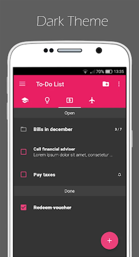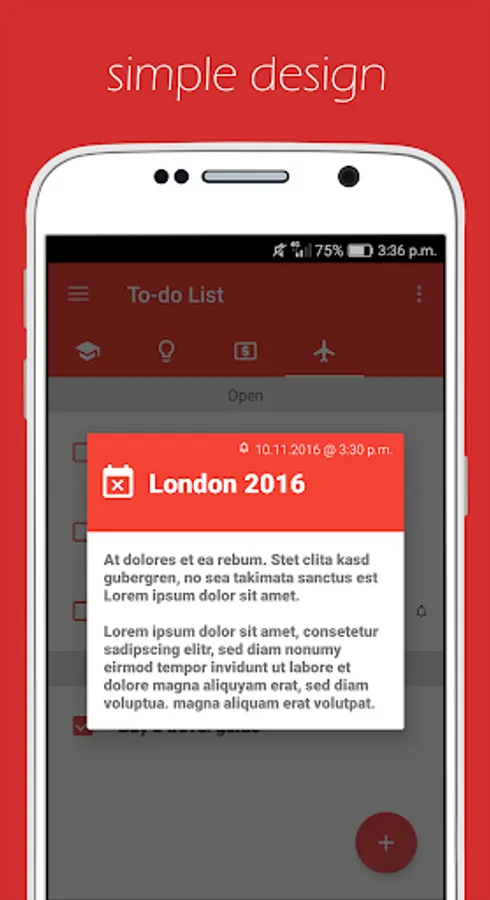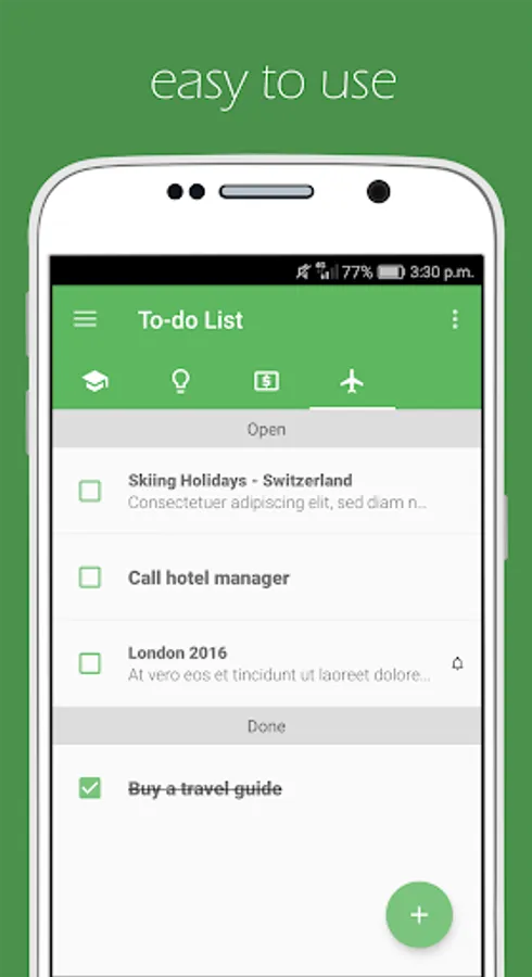 The app „Simple To-Do List“ offers you an easy opportunity to write down your tasks and to-do's. Break up your to-do's into groups to get a better overview over all your tasks. The app provides you only the most important functions for to-do's and renounces on unnecessary things.