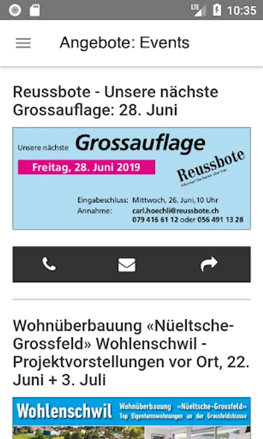The Reussbote brings the latest local news and advertisements from the newspaper in short form on the Internet, Facebook, Twitter, public screens, tablets and mobile.