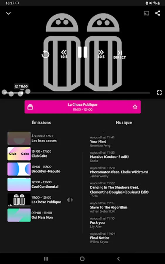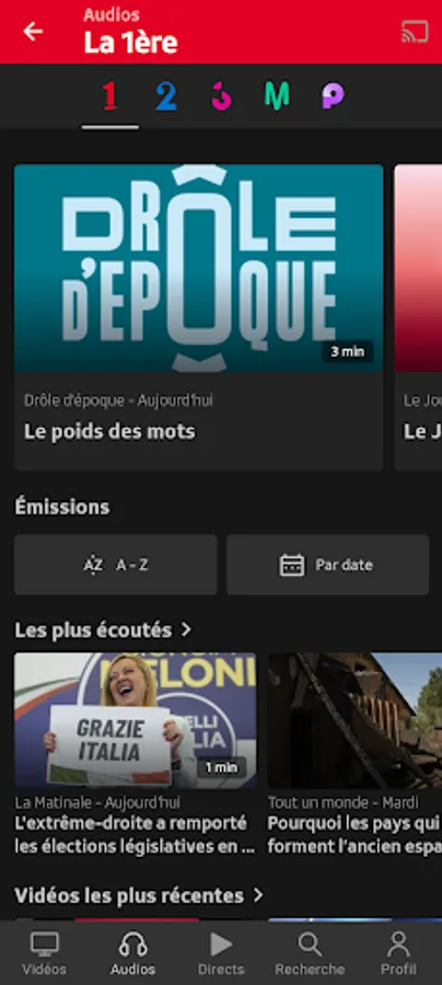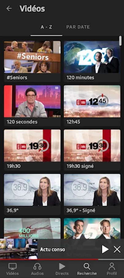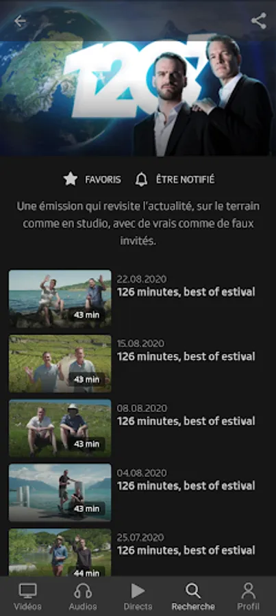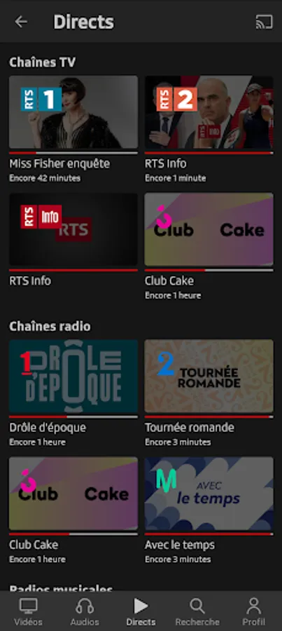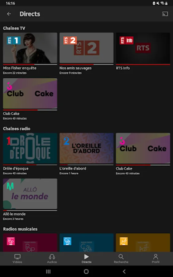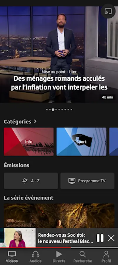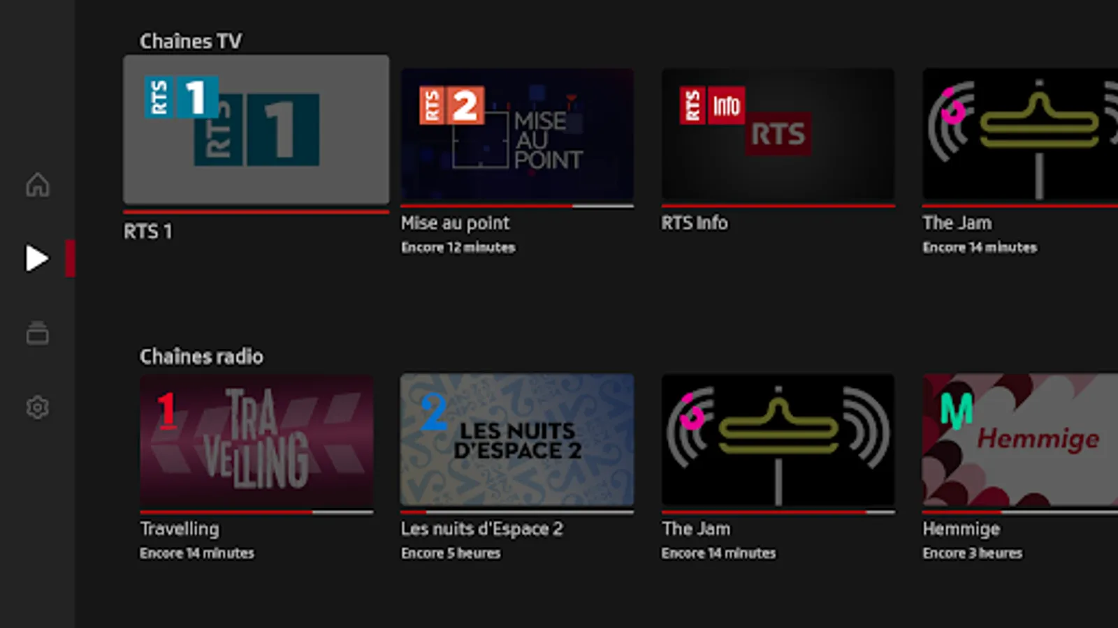Play RTS lets you view the content broadcast by RTS through its TV (RTS Un and RTS Deux) and Radio (La 1ère, Espace 2, Couleur 3, Option Musique) channels, as well as those offered by Tataki and via the offers Original Podcasts.