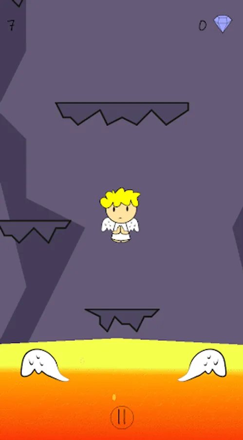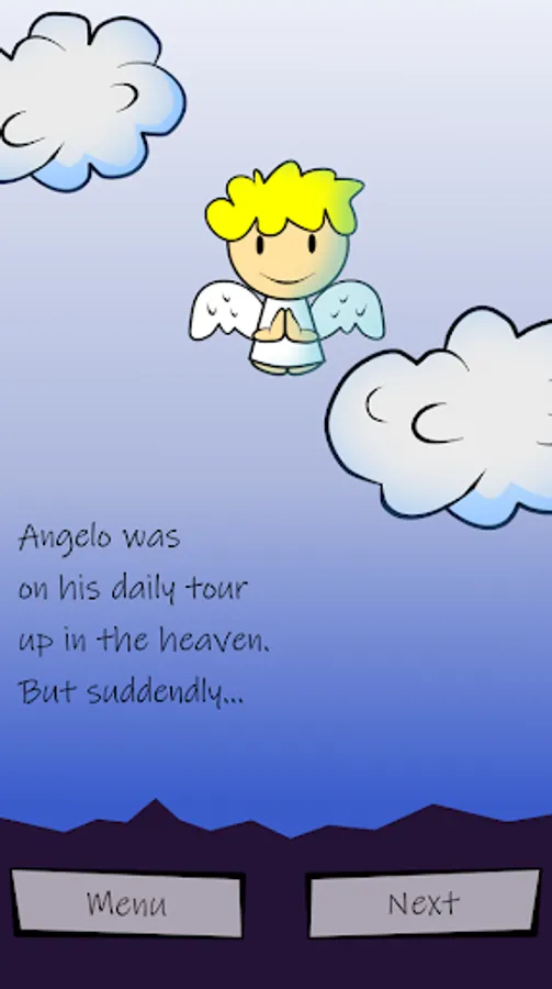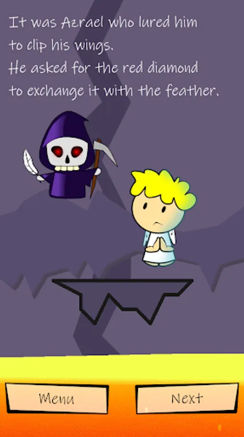 Angelo flew into a crack and met Azreal there. Azreal clipped his wings and now Angelo can't fly anymore. He must find the red diamond to regain the power of flying.
