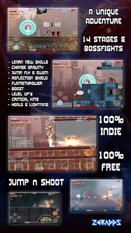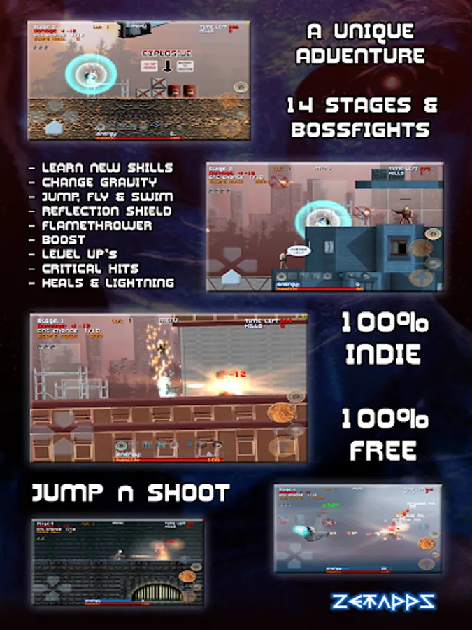 Play as male or female X with different abilities and get more power, skills and weapons during your adventure on the unknown planet. Fight through 14 ground - air - falling - water and underwater stages! Survive challenging bossfights and collect enough energy crystals to save your species. Transform into GravBall to change gravity, absorb enemy fire and a lot more!