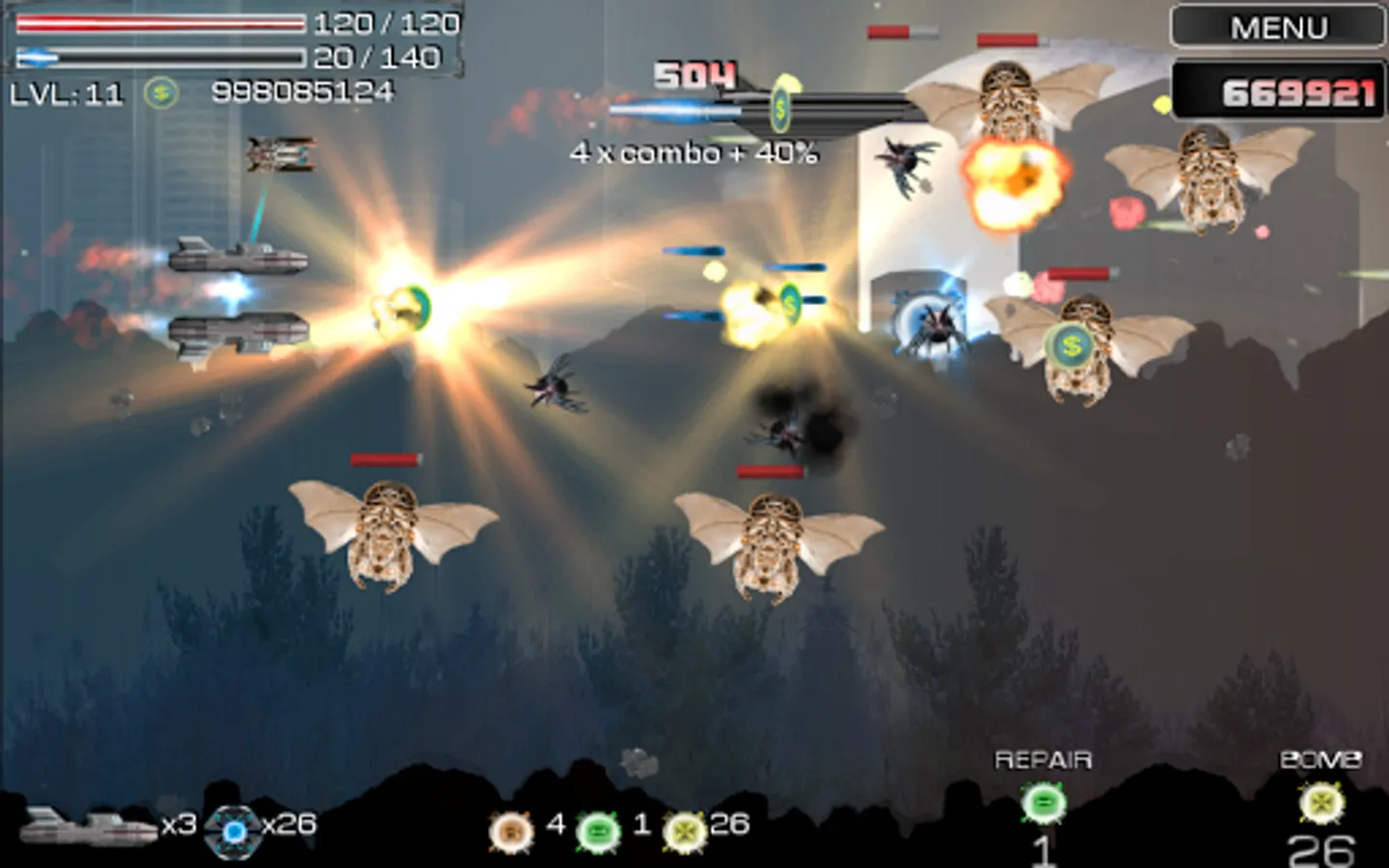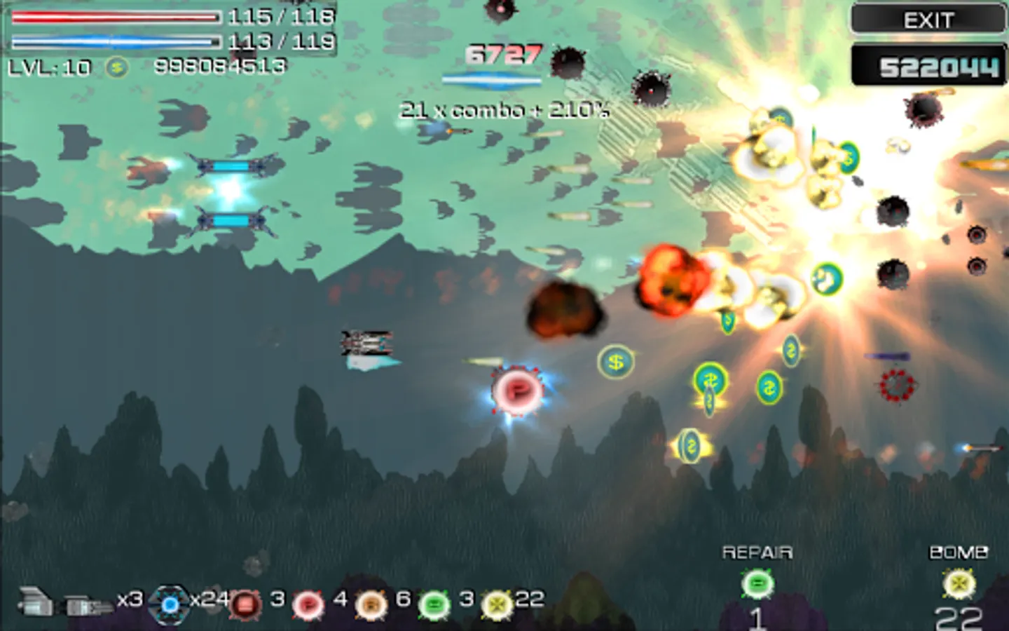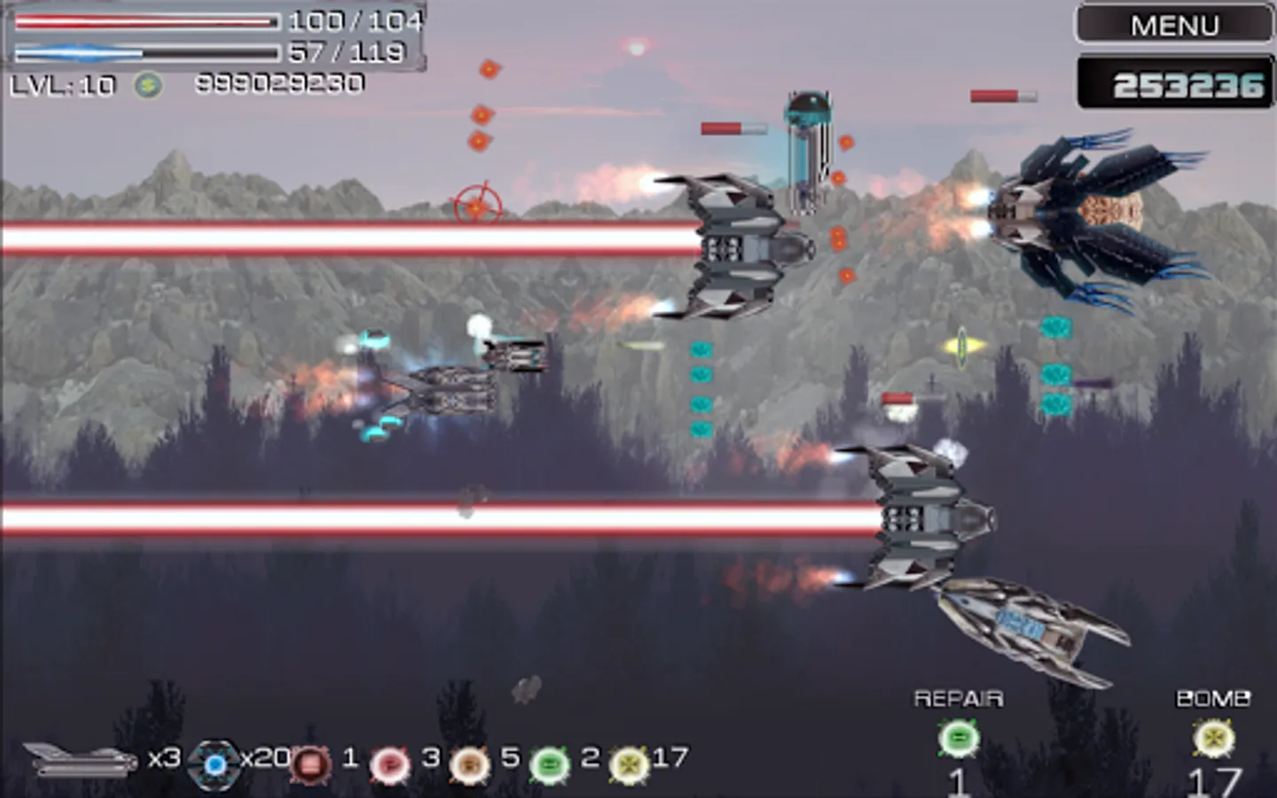 Control 2 Wings of Choice and carry the modified energy core to the invader core to unlock new worlds. Gain Experience Points to permanent Level Up and unlock Skill-points for more Firepower and Core abilities. Upgrade to the maximum in this fast pace action shooter! Colonize conquered Worlds and modify your Heavy Metal Wings to play the way you like it. Each of the 7 Worlds has 3 Story Stages, 1 Boss-fight, 1 Bonus Stage and endless random generated Orbit Patrol Missions. Over 100 power ups and permanent Sky Striker Upgrades such as controllable and upgradeable drones, quick-bar items, hyper screen bombs and tons of other visible upgrades can be installed and attached to your core. Choose one of 5 balanced difficulty Levels for the perfect fun match. Easy entry with for new players with full action fun and a epic challenge on hard for pro players. Master the Daibouken Combo System to fight for World Rankings in this huge full speed space & sky, Bullet Hell Action SHMUP (-> Shoot em up!). Play now, it's 100% free and unlimited!
