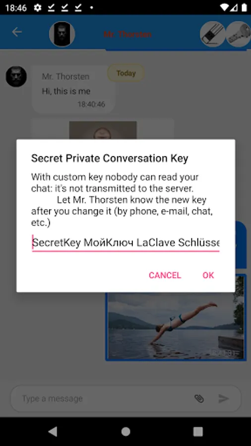 - Using a key you can easily encode your chat. This is the way to have private conversations that won't be seen by your husband or your wife, your parents or authorities. Also photos will be encoded as well!