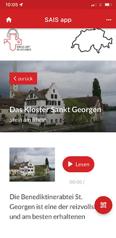 Flash the QR-code and immerse yourself in the history of Swiss monuments. Available in French, German, Italian and English, the Swiss Art in Sounds audioguides summarize points of interest specific to each site. Through audio tracks of a few minutes, you will be guided around and inside the buildings. The Swiss Art in Sounds experience is complemented by an image gallery and a video clip for each audio guide.