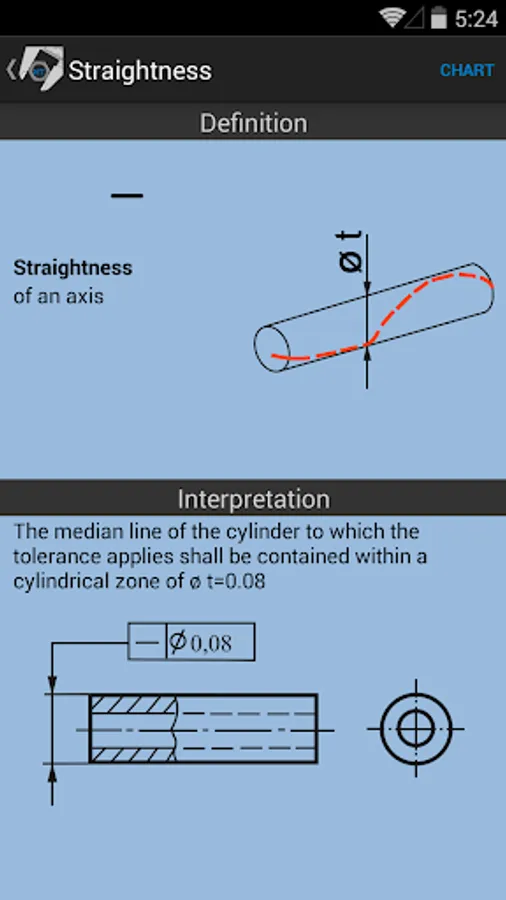 Geometrical Tolerances: Symbols, drawings and explanations as well as charts for the different geometrical tolerances.