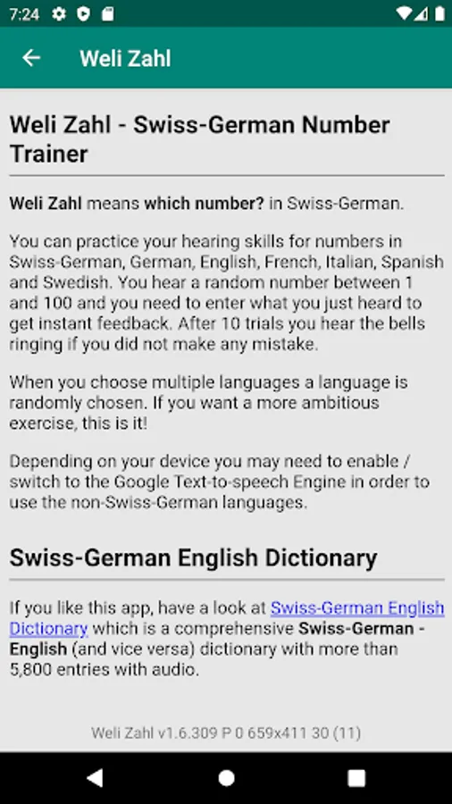 Practice your understanding of spoken numbers! You hear a number in Swiss-German and you type in the number you just heard to get instant feedback. After a series of 10 numbers you get a grade.