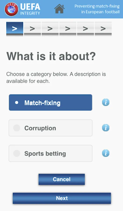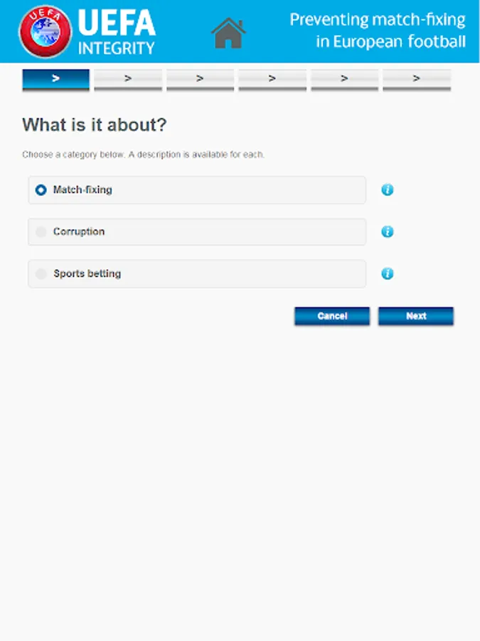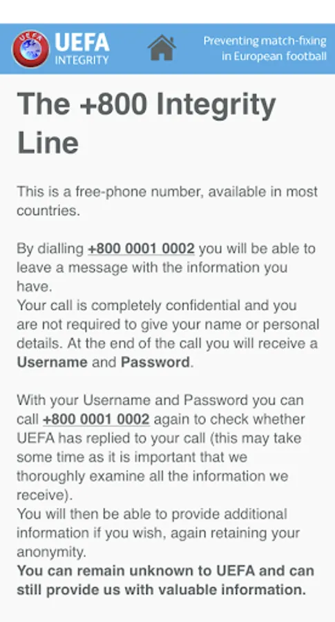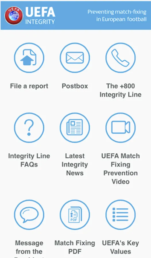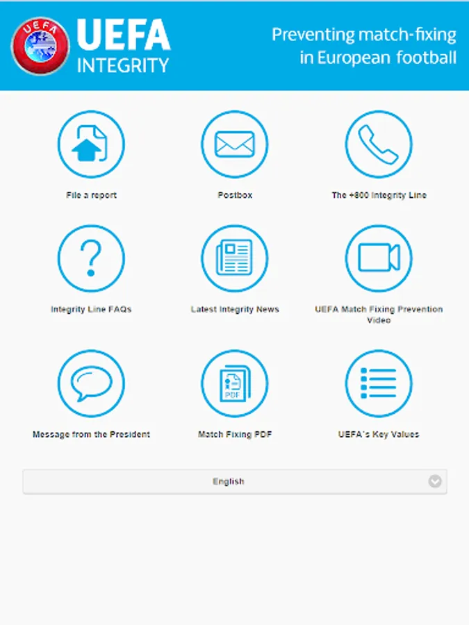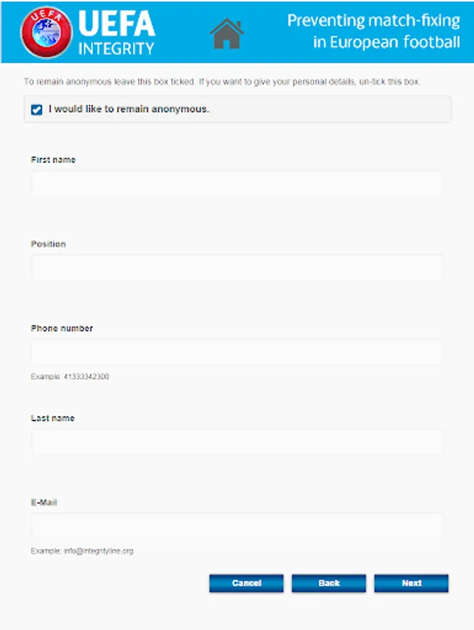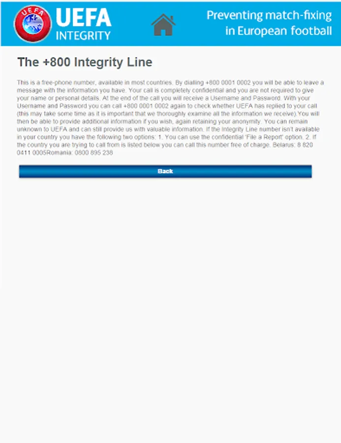 The UEFA Integrity Application allows you to provide valuable information to UEFA concerning Match-fixing or corruption. This may be information concerning a match; a player, a match official (a referee or an assistant referee) or any other individual linked to football.
