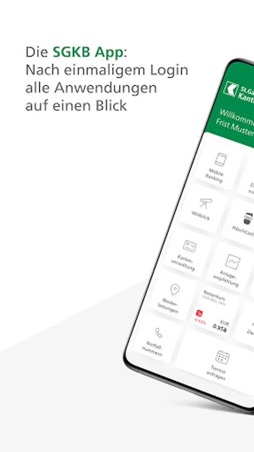 The St.Galler Kantonalbank (SGKB) app is your mobile access to all important financial applications. After logging in once with a PIN or TouchID/FaceID, all applications are immediately available to you.