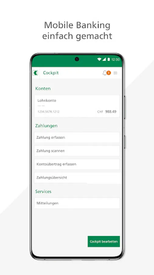 You can also use SGKB's most important e-banking functions on the mobile channel. Thanks to the cockpit that can be personalized, you can get a quick overview right from the start page and get to the most important functions quickly. Scan payment slips with the camera or use the intelligent payment mask to record payments.