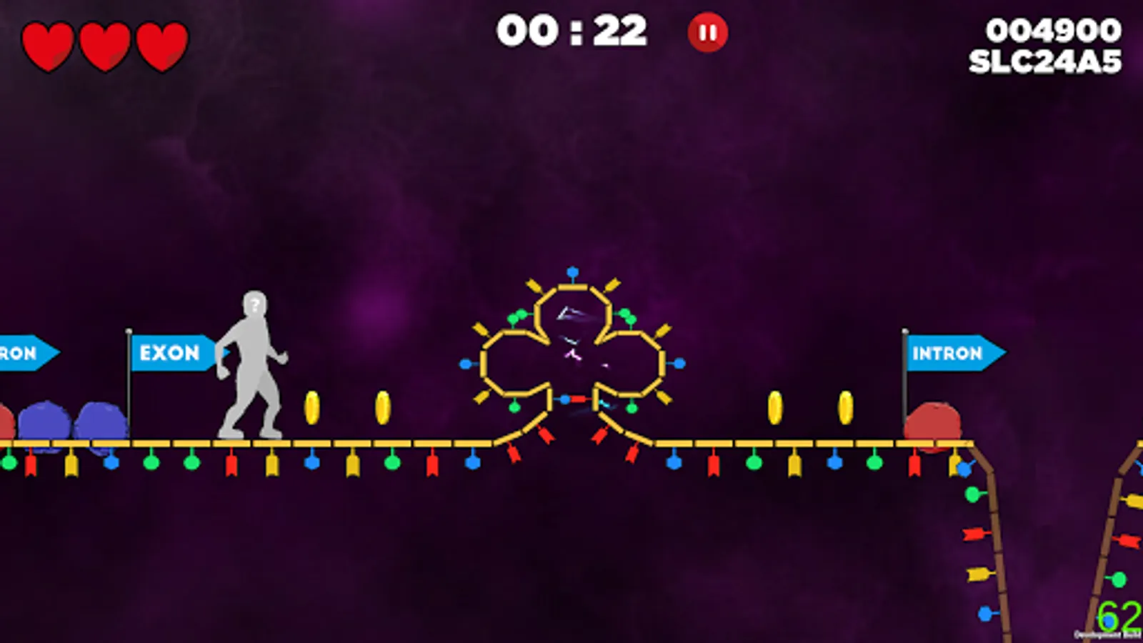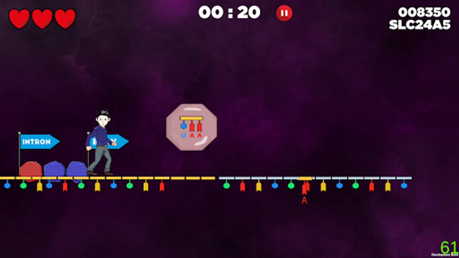 o You will be running along the coding part of genes (exon) – but beware of the non-coding areas (introns)! Jump over them or ride specific proteins that will take you safely to the next exon.