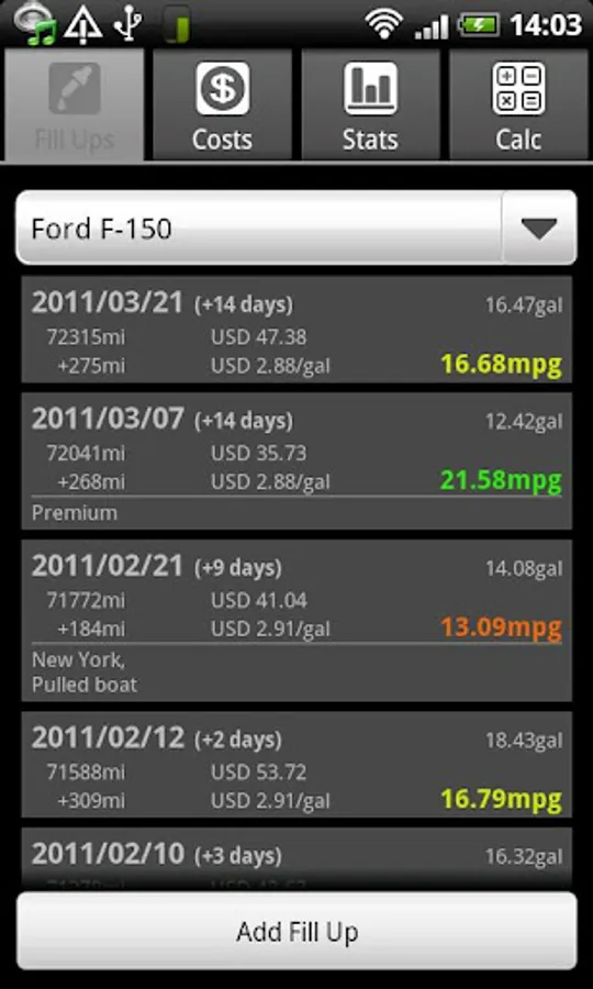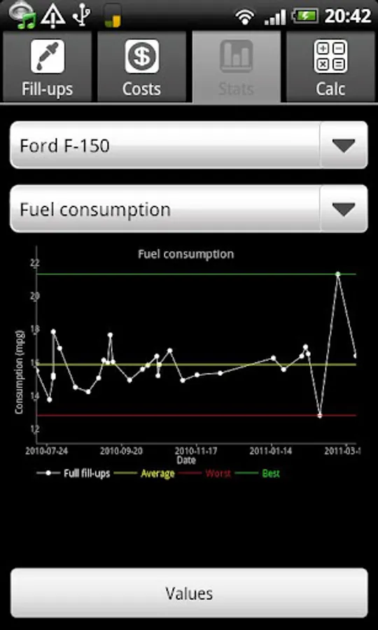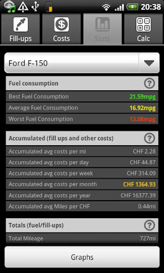 6 different nice-looking graphical charts show the fill ups (only Android 2.1 and newer)