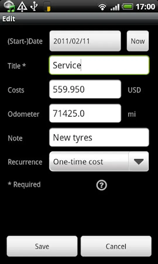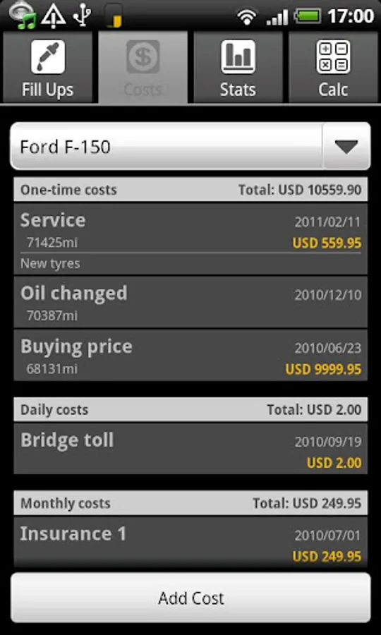 Track all kind of costs and maintenances/services like for example monthly insurance, daily bridge toll, yearly taxes, services, car parts, parking costs, oil or tyre changes, and a lot more... (limited to 15 entries in the free version)
