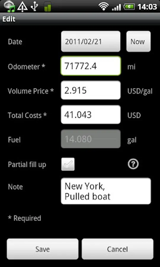 The stored fill ups and costs can be exported as a *.csv file for further calculations on your computer or just to be saved as a backup on your sdcard. If you have stored your gas purchases and maintenances/services on the computer or if you want to restore a previous backup, you can import the data in FuelLog (only FuelLogPro). If you have problems importing your data or if you want to convert an export from another App, from the iPhone or from a website, just send me an email, I will help you!