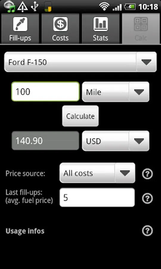 Use the included calculator to calculate costs, used/needed fuel volumes and distances for your next trip or the daily way to work with your car, based on the automatically gathered statistical data.