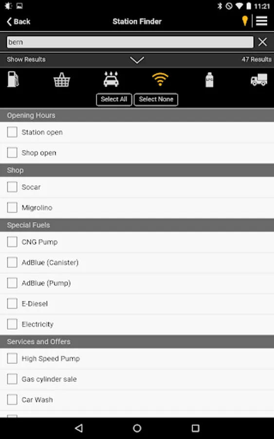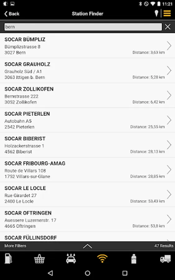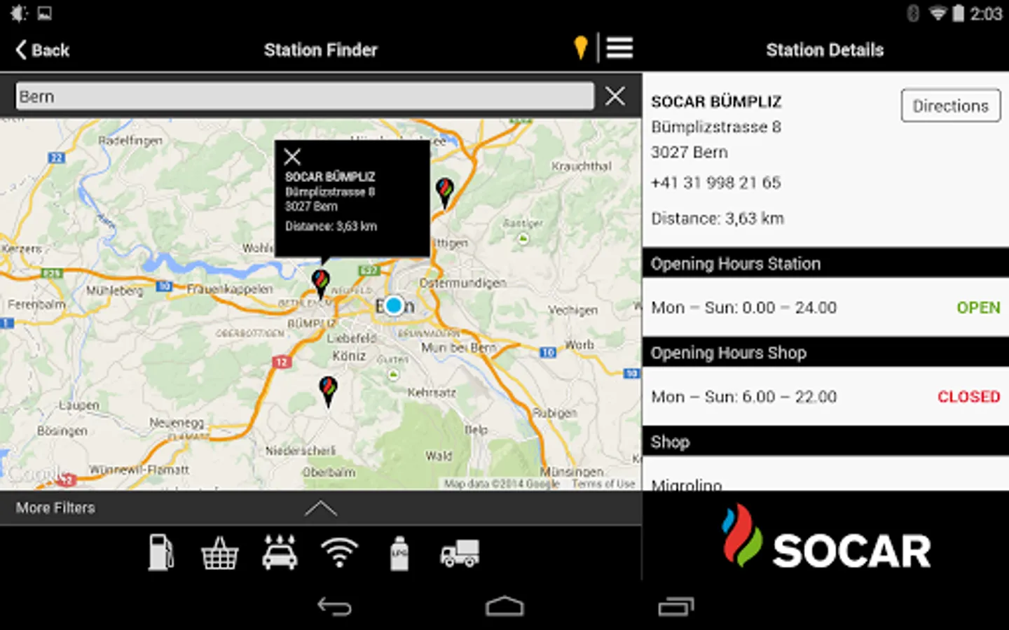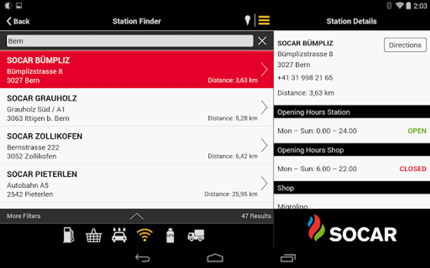 SOCAR Station Finder will help you to find SOCAR filling stations and SOCAR shops in Switzerland. It allows to find stores and shops based on nearest location and on specific filtering options, such as: