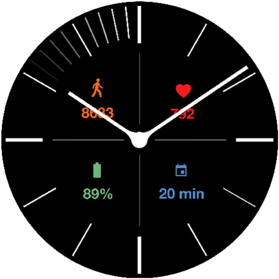 With its elegant and simple design, this analog watch face focuses on personalization and readability.