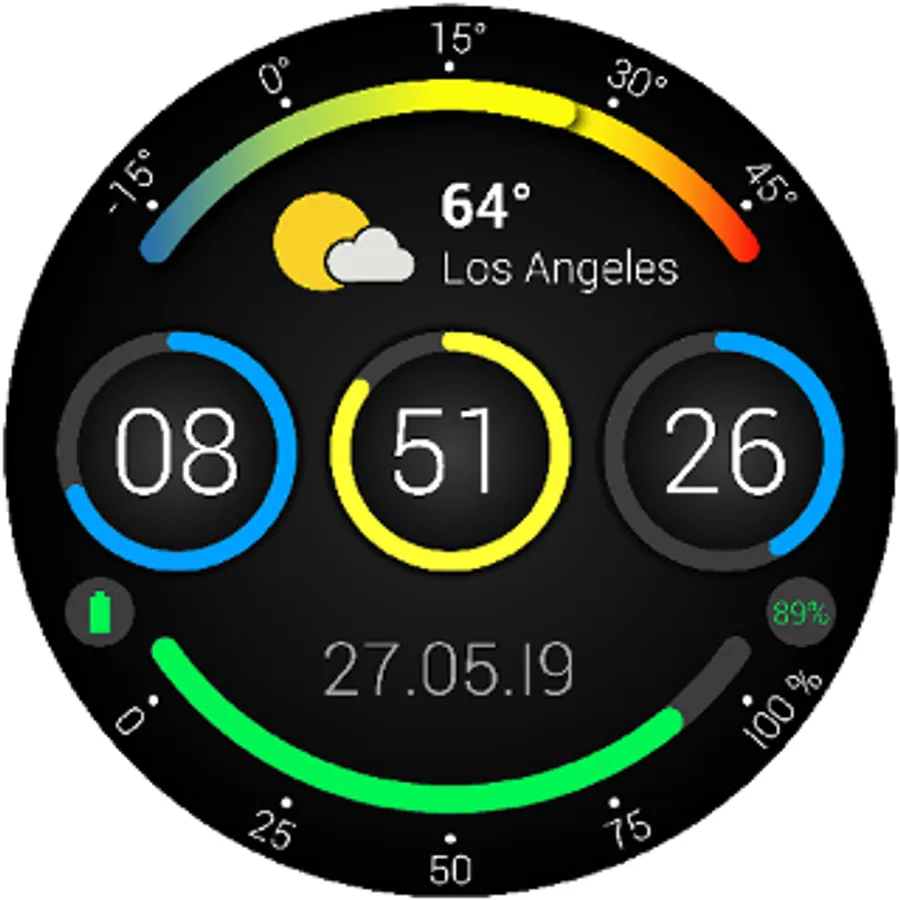This watch face was designed to display multiple types of data with gauge indicator on top and bottom of the dial. Here is a short description of the data displayable.
