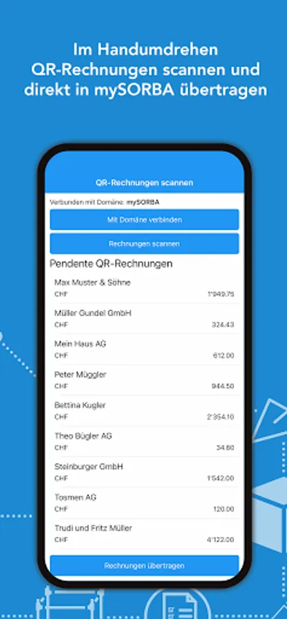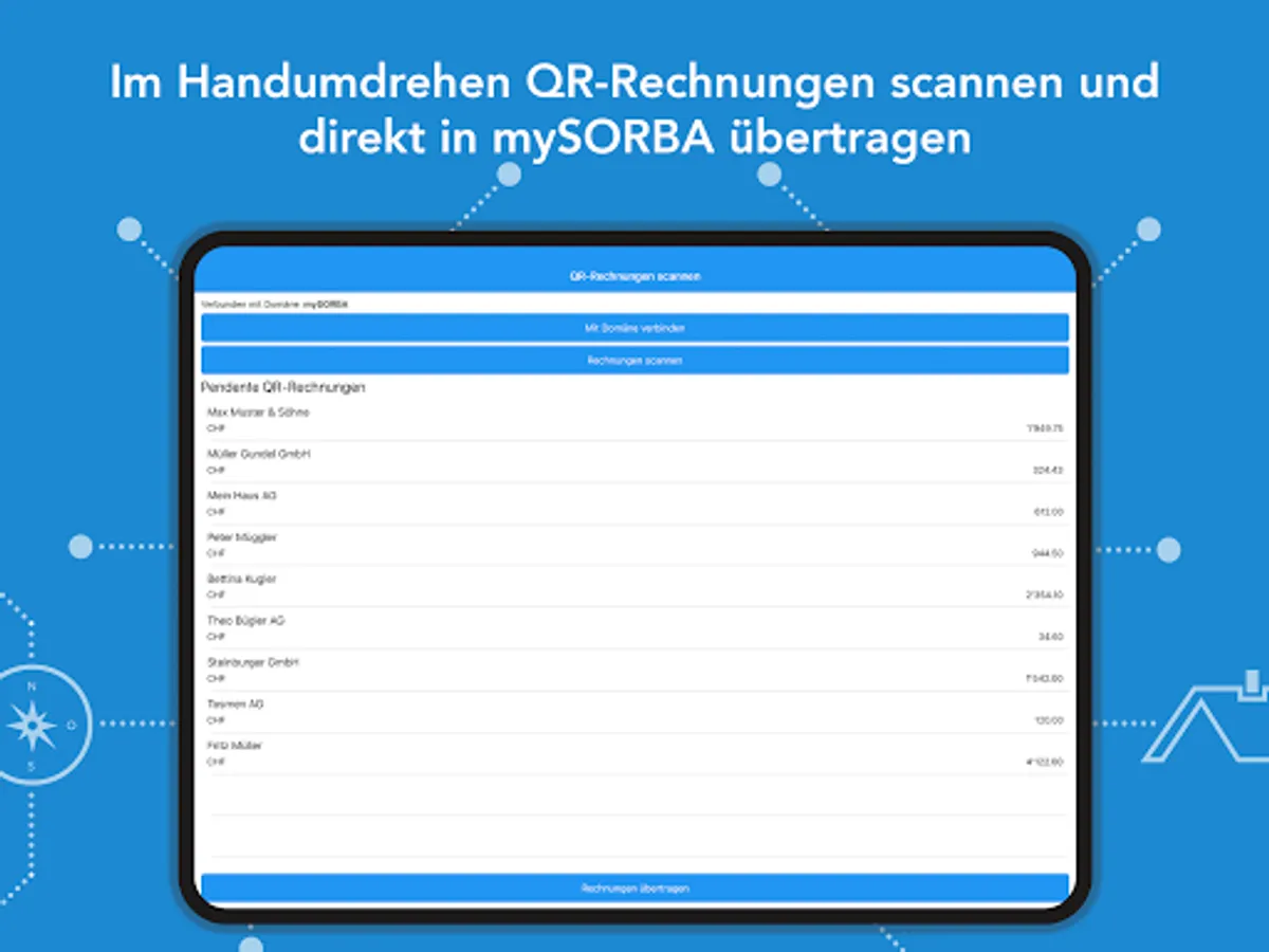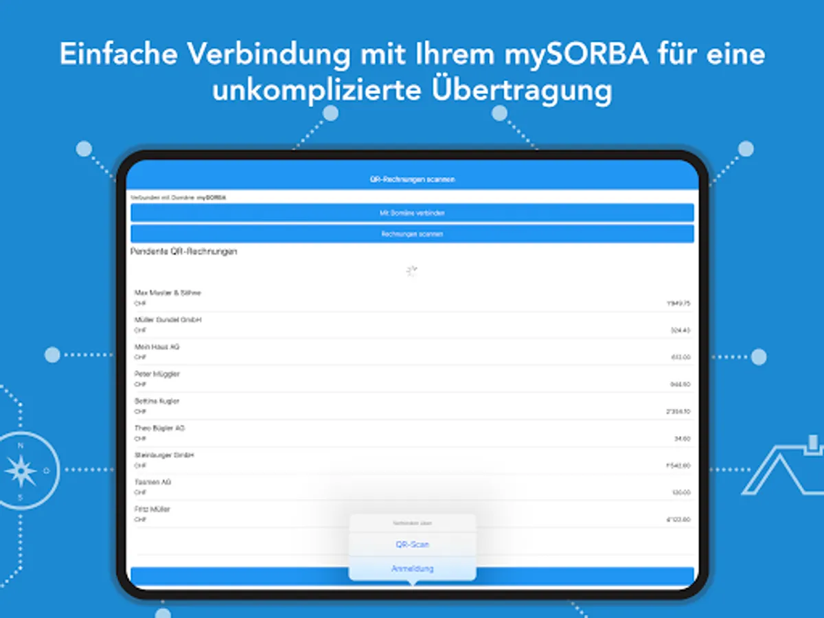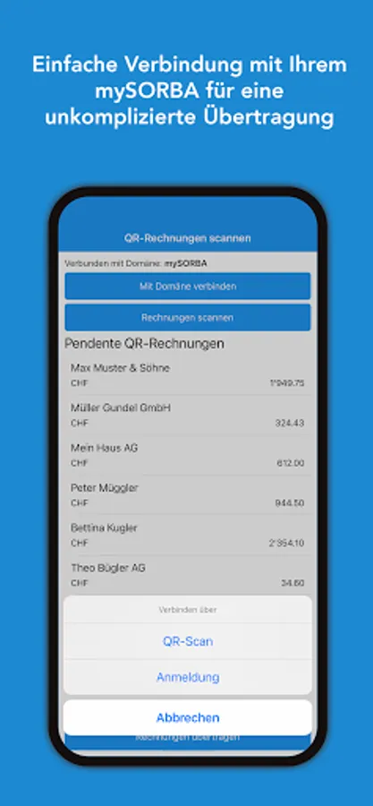 The app is connected to the accounts payable module of the mySORBA ERP system via a QR code.