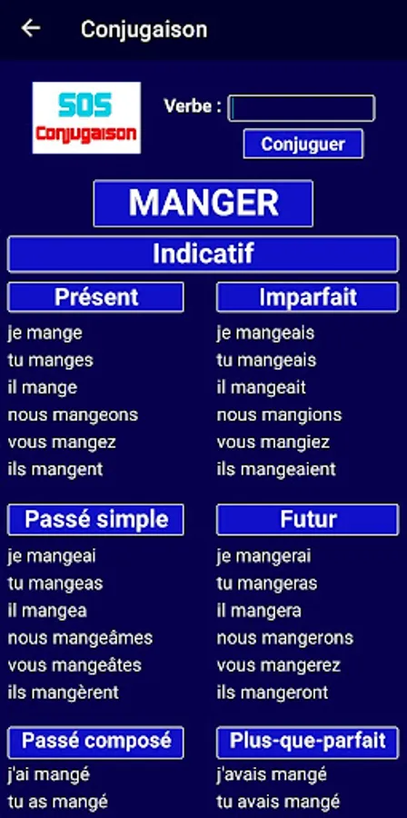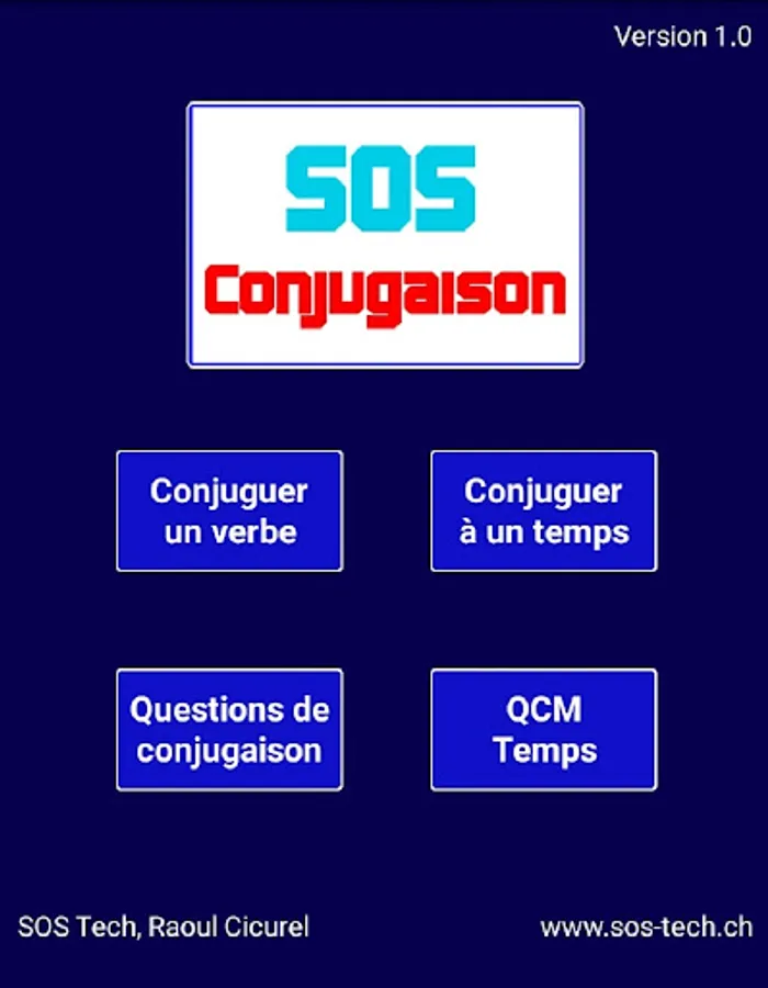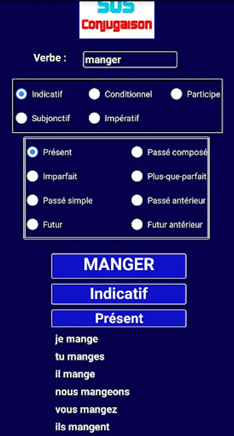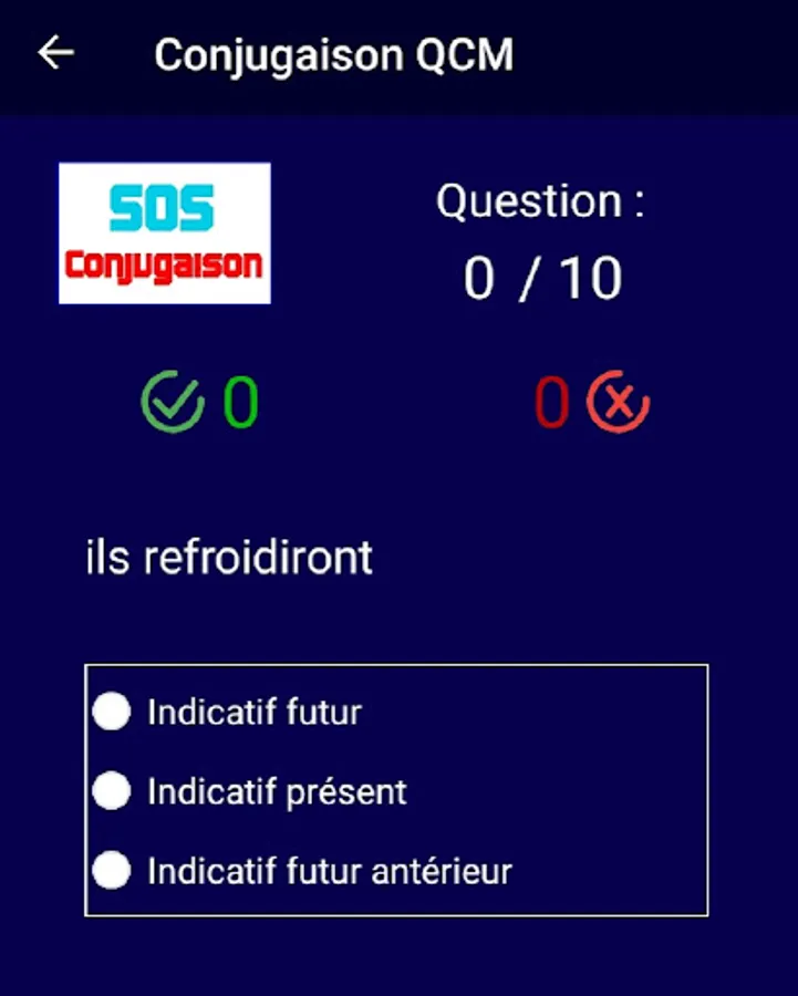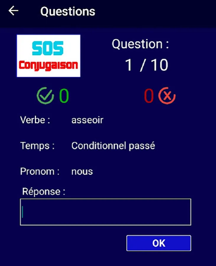 This application allows you to find the conjugation of French verbs and to test your knowledge of them thanks to conjugation questions or a MCQ on times.