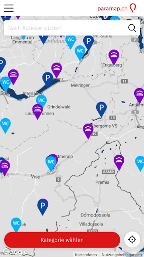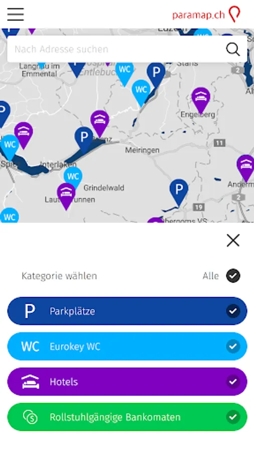 With paramap.ch you are traveling more mobile and flexible! Find quickly and easily a wheelchair Parking, a wheelchair-accessible accommodation, a Eurokey toilet or a barrier-free ATMs.
