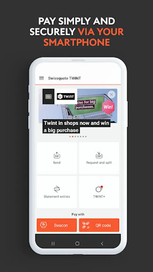 The Swissquote TWINT app makes your life easier: make secure payments with your smartphone in shops, restaurants, online, and when using machines and parking meters. You can also send or request money from your contact list in just a few clicks, buy digital vouchers, make donations, register customer cards and use digital coupons.