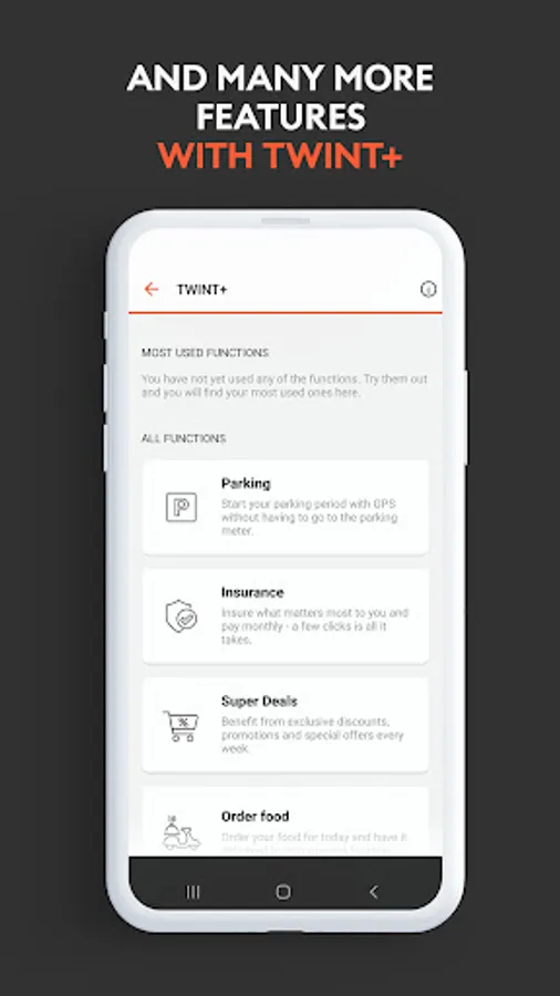 The TWINT+ section provides you with quick access to a range of features available on the Swissquote TWINT app: have your meal delivered, buy digital gift vouchers, make a donation, pay your parking fees, withdraw cash or take advantage of Super Deals.