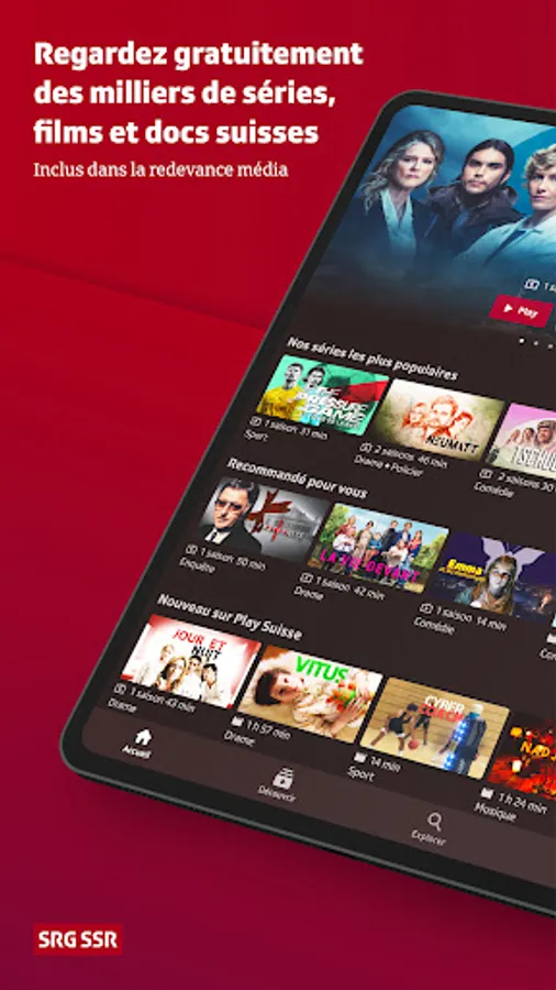 Play Suisse offers you the best of productions and co-productions from RTS, RSI, RTR and SRF. The financing of Play Suisse is covered by the radio and television license from the SSR. Watch Tschugger, Wilder, The Undertaker, Abysses, Crisis Unit, Detectives...or Almost and other captivating series, films and documentaries for free.
