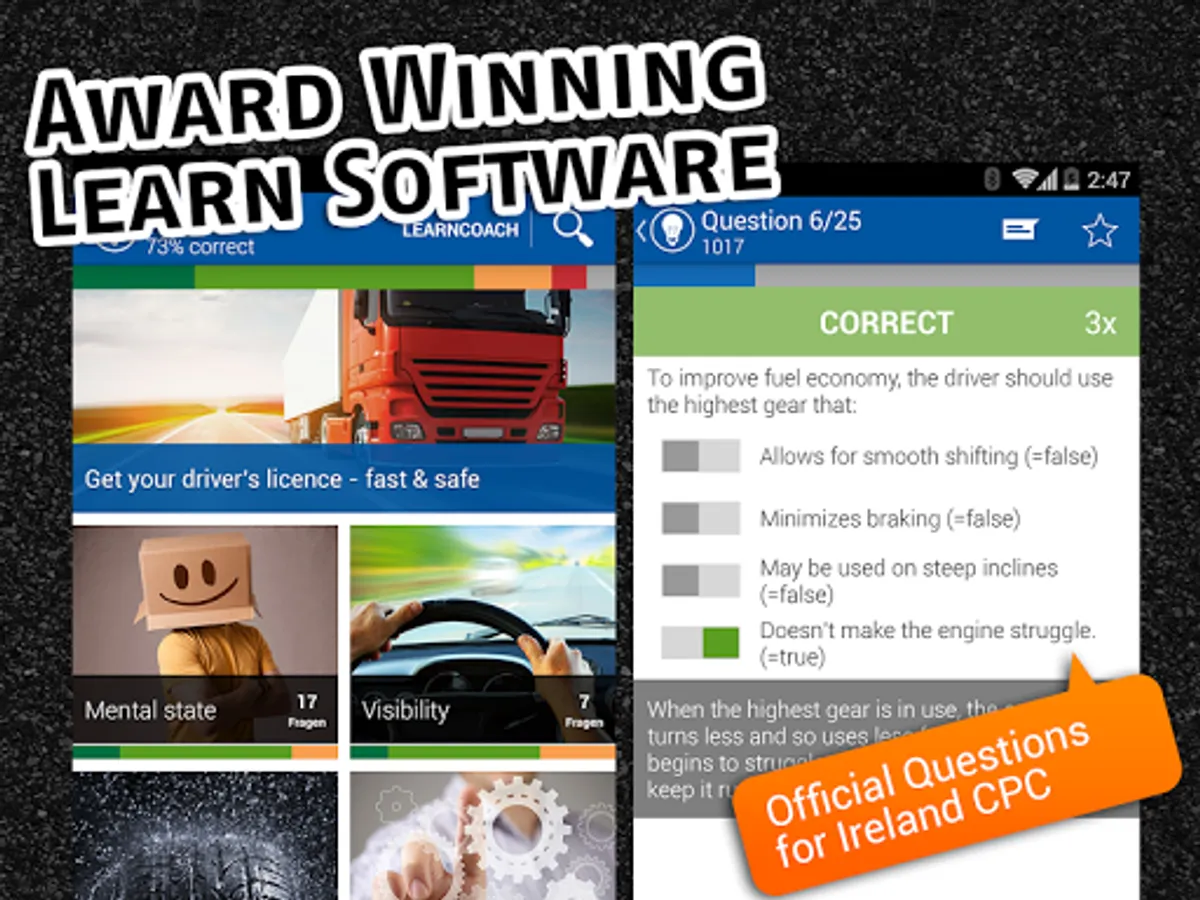 1. 170+ OFFICIAL QUESTIONS- All theory questions are based on the newest OFFICIAL Driver CPC Truck and Bus Theory catalogue of Ireland. This includes ALL topics needed to pass your exam.