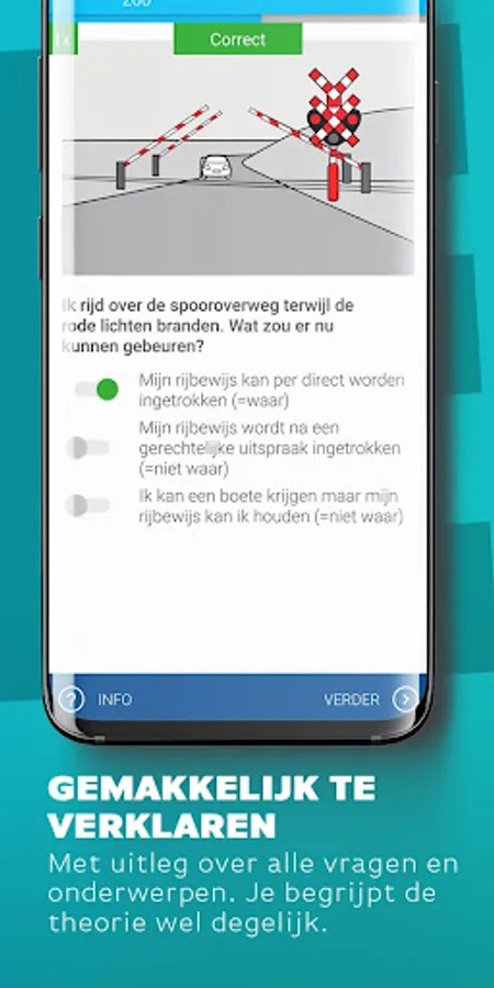 The learning mode allows you to practice all the questions that apply to your theory exam. The questions are divided into 7 categories so that you can practice in a targeted way.