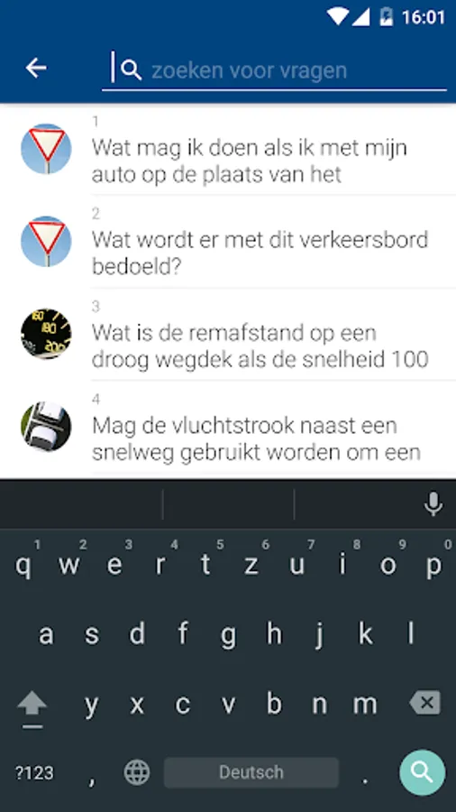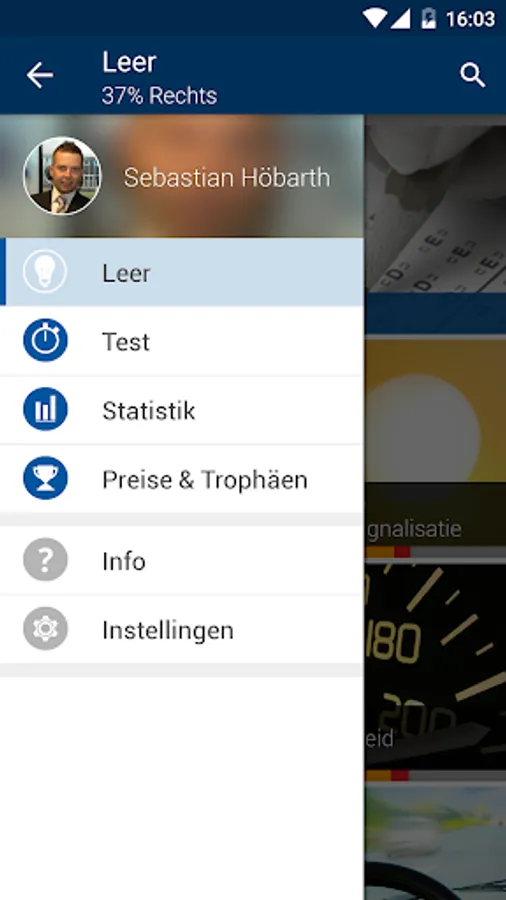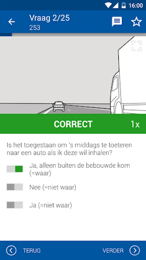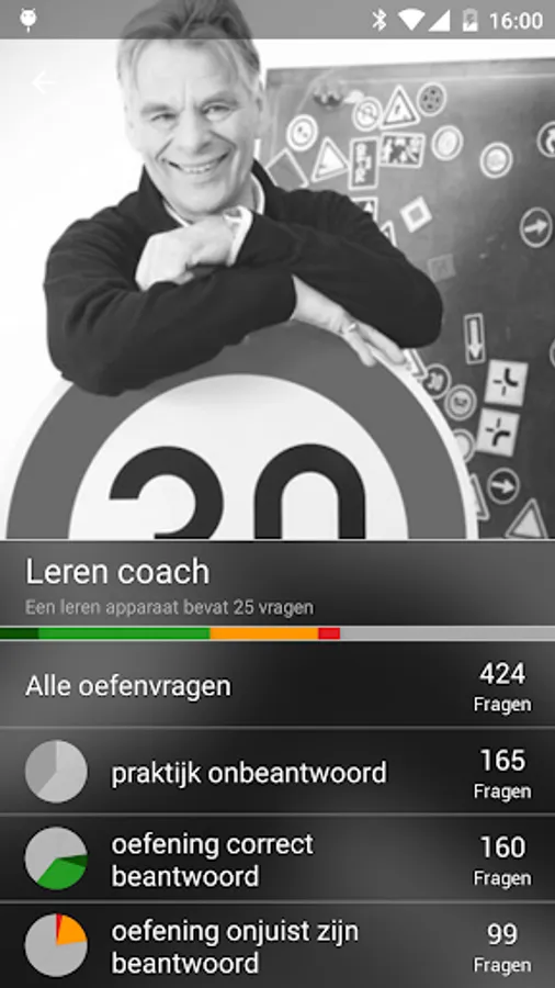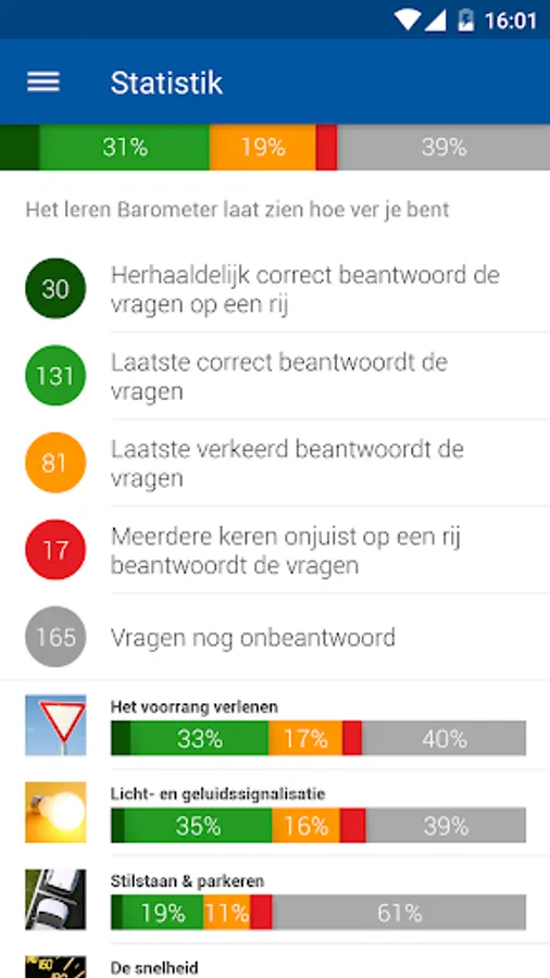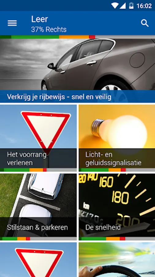The learning mode allows you to practice all the questions that apply to your theory exam. The questions are divided into 7 categories so that you can practice in a targeted way.