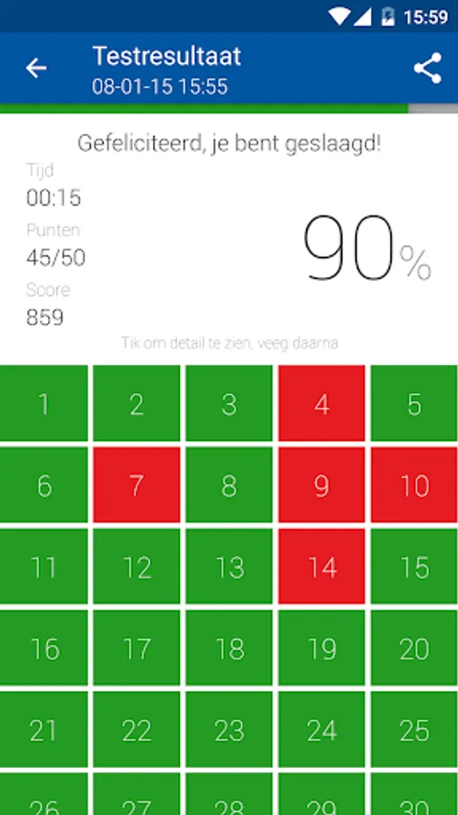 The test mode allows you to simulate a real exam. This practice exam is very similar to the actual exam, with a time limit of 45 minutes. The result is visible as soon as the exam is over, so you can immediately see whether you have passed or not. You can find the questions that have been answered incorrectly together with the correct answers.