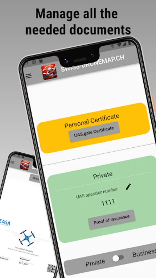 With our app, you can also manage all the documents you need, such as the remote pilot certificate, the operator number and the insurance certificate, both for private and for business, so you always have them with you.