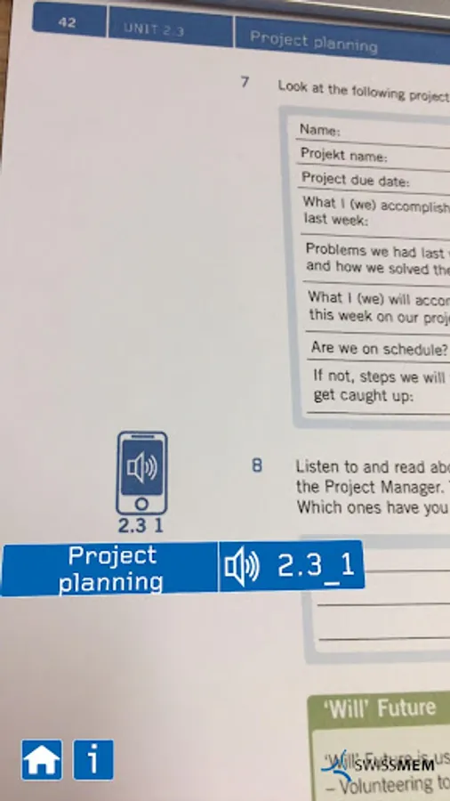 All audios and videos marked in the book can be accessed through an augmented reality extension directly from the book; , the camera is held in the scan mode via the appropriate exercise. The app recognizes the page and provides the right topic for selection.