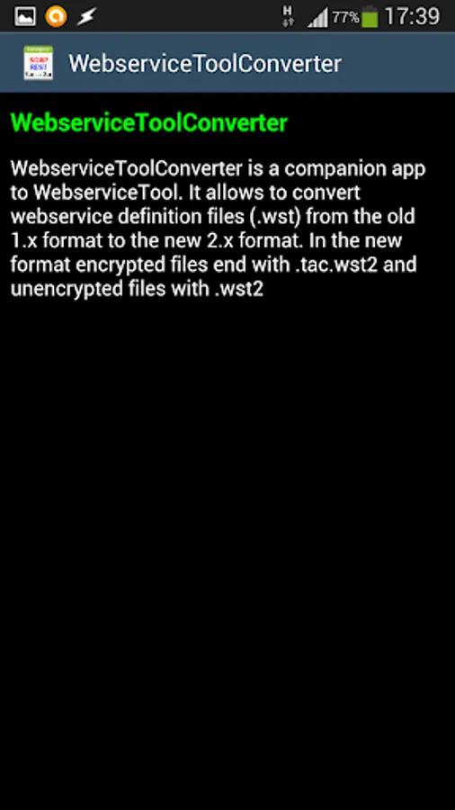 This app allows to convert webservice files of the app WebserviceTool from the old 1.x to the new 2.x format