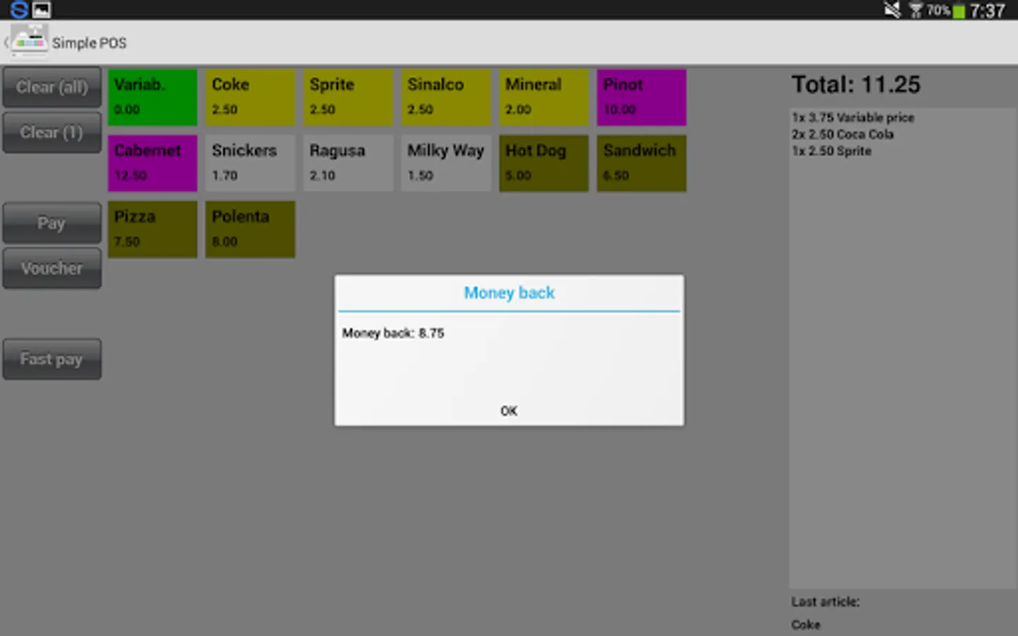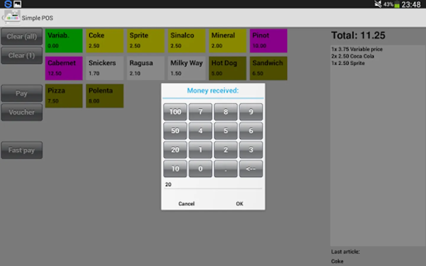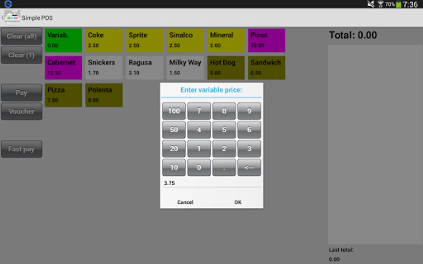 SimplePOS is a cashier application which is simple to use and runs completely autonomously on your tablet.